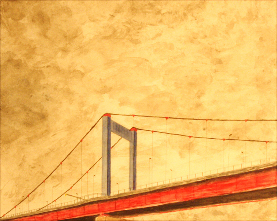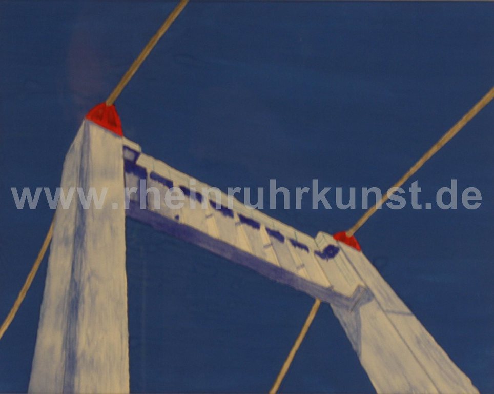 Dieses Aquarell zeigt die Ruhrmündung von der Ruhrorter Seite aus. Die Stelle wird durch das Rheinorange markiert. Im Hintergrund befindet sich die Rheinbrücke der BAB 40 und die Huntsman Industrieanlagen in Duisburg Homberg.